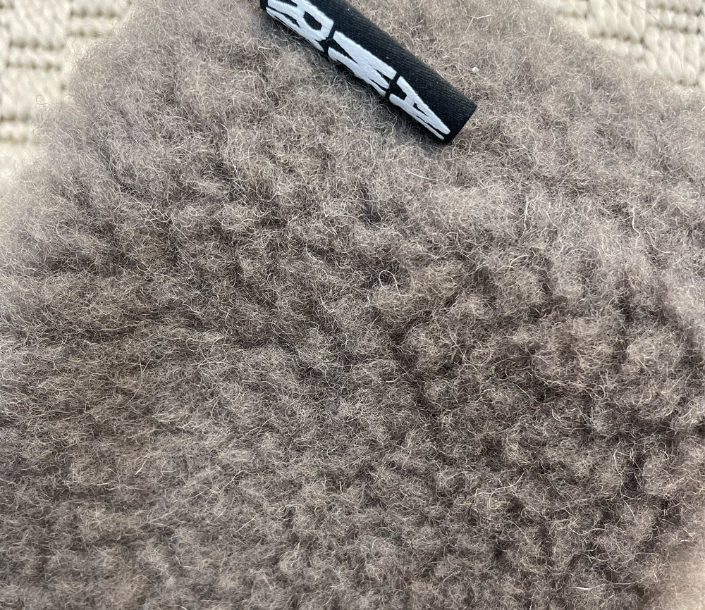 100 % Wolle in einem Fleece mit Schaffellstruktur und einer sehr leichten Formel. Der Stoff zeichnet sich durch außergewöhnliche Weichheit und Elastizität aus, wodurch er uns sanft umhüllt. Charakteristisch für dieses Material ist seine schwarze Basis, die die Farbe des verwendeten Wollvlieses intensiv zur Geltung bringt.