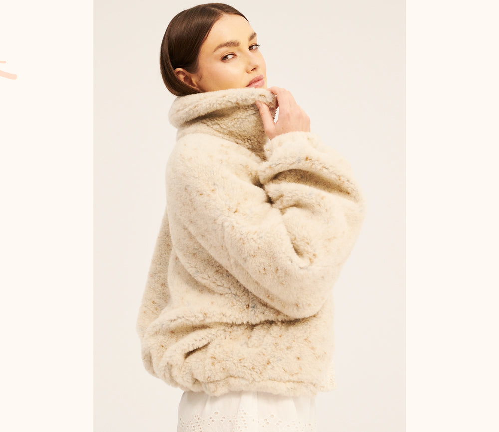 - ULTRALEICHTE WOLLE 100 % Wolle in einem Fleece mit Schaffellstruktur und einer sehr leichten Formel. Der Stoff zeichnet sich durch außergewöhnliche Weichheit und Elastizität aus, wodurch er uns sanft umhüllt. Charakteristisch für dieses Material ist seine schwarze Basis, die die Farbe des verwendeten Wollvlieses intensiv zur Geltung bringt.