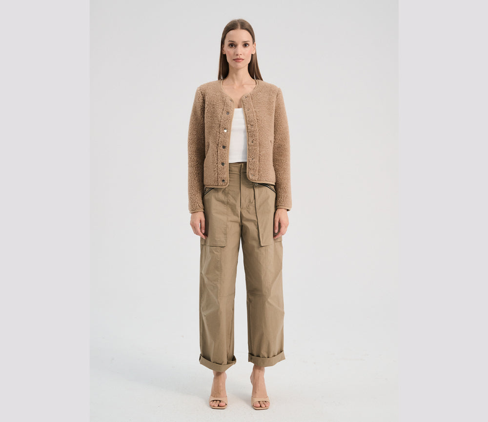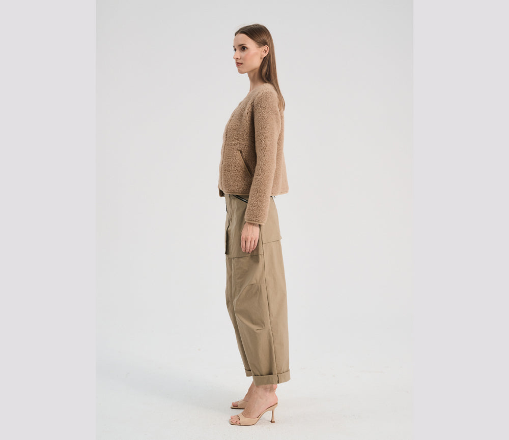 ULTRALEICHTE WOLLE 100 % Wolle in einem Fleece mit Schaffellstruktur und einer sehr leichten Formel. Der Stoff zeichnet sich durch außergewöhnliche Weichheit und Elastizität aus, wodurch er uns sanft umhüllt. Charakteristisch für dieses Material ist seine schwarze Basis, die die Farbe des verwendeten Wollvlieses intensiv zur Geltung bringt.