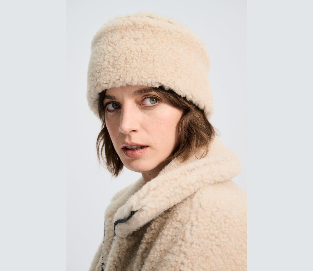 100 % Wolle in einem Fleece mit Schaffellstruktur und einer sehr leichten Formel. Der Stoff zeichnet sich durch außergewöhnliche Weichheit und Elastizität aus, wodurch er uns sanft umhüllt. Charakteristisch für dieses Material ist seine schwarze Basis, die die Farbe des verwendeten Wollvlieses intensiv zur Geltung bringt.